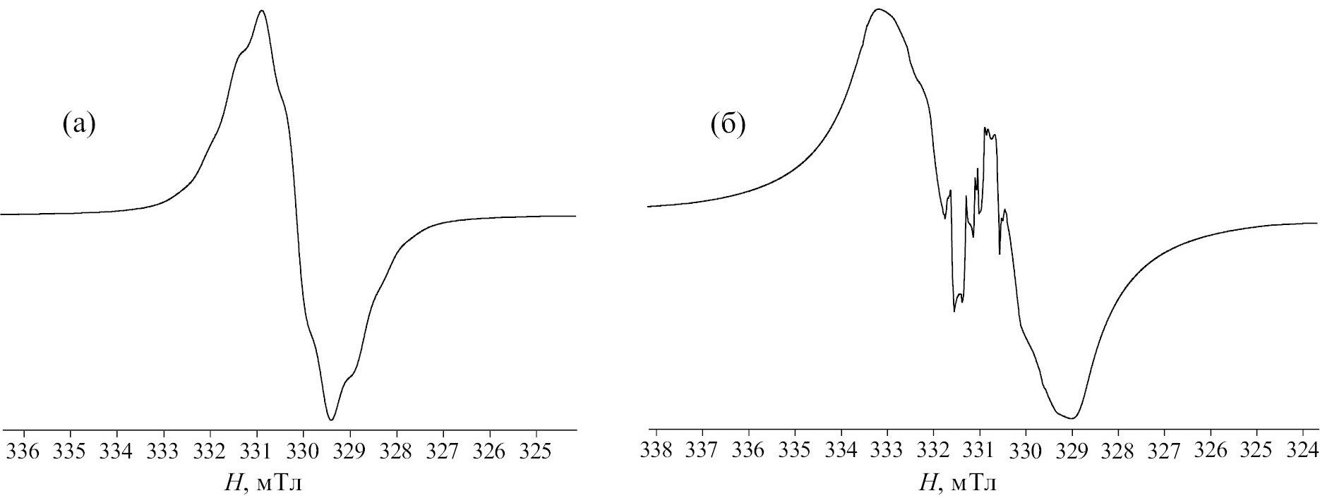 Рис. 4. Спектр ЭПР соединения 1в в бензоле (а) и твердой фазе (б) при комнатной температуре