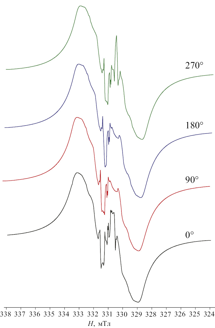 Неразрешенный сигнал ЭПР в растворе для соединений 1а–д обусловлен обменными процессами, которые связаны с присутствием в структуре данных соединений двух неспаренных электронов. Наличие в твердофазных ЭПР спектрах соединений 1а–д тонкой структуры, также обусловлено присутствием в молекуле двух неспаренных электронов, что является неоспоримым доказательством образования бирадикалов. Кроме того, при повороте твердого образца в ячейке ЭПР спектрометра наблюдается изменения тонкой структуры спектра, обусловленные магнитной анизотропией кристаллического поля (рис. 5).
