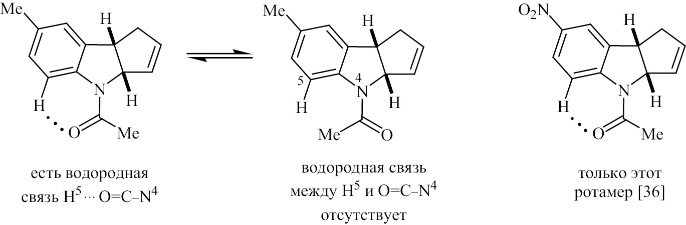 Возможность образования этой водородной связи, и вместе с тем и существование двух равновесных состояний исчезает, когда при углеродном атоме С5 ароматического кольца появляется заместитель, иной, чем атом водорода. В спектрах ЯМР N-ацетил-5-нитро-7-метил- или N-ацетил-5-амино-7-метил-1,3а,4,8b- [39], а также N-ацетил-5-метил-1,3а,4,8b-тетрагидроциклопента[b]индола [40] удвоение сигналов протонов и углеродных атомов отсутствует.
