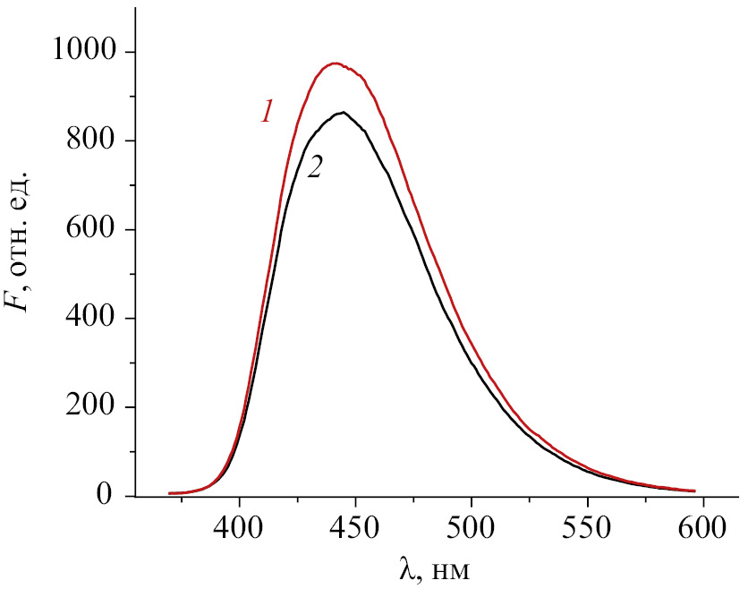 Рис. 6. Флуоресцентные спектры образцов 11 (1) и 12 (2) в растворах ДМФА (ширина щели возбуждения – 5 нм, ширина щели излучения – 5 нм)