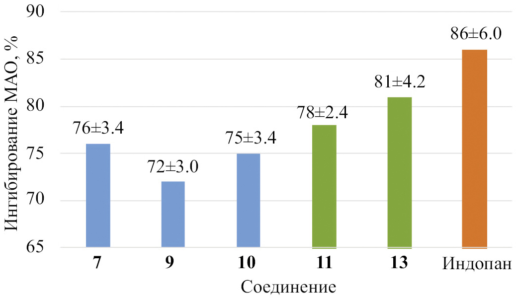 Рис. 9. Влияние соединений 7, 9–11, 13 на угнетение МАО-активности в концентрации 1.0 мкмоль/мл в процентном отношении к контролю (индопан)