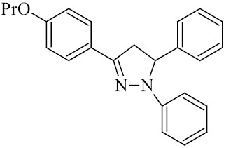 1, 5-Дифенил-3-(4-пропоксифенил)-4,5-дигидро-1Н-пиразол (11). Выход 84%, т. пл. 130–132°С. ИК спектр, ν, см–1: 1597 (C=N). Спектр ЯМР 1H, δ, м. д.: 1.07 т (3H, CH3, J 7.4 Гц), 1.75–1.87 м (2Н, CH2CH3), 3.06 д. д (1H, CH2CH, J 17.1, 7.1 Гц), 3.86 д. д (1H, CH2CH, J 17.1, 12.2 Гц), 3.94 т (2H, ОCH2, J 6.5 Гц), 5.27 д. д (1H, CHCH2, J 12.2, 7.1 Гц), 6.63–6.69 м (1H, C6H5), 6.84–6.89 м (2H, C6H4), 6.93–6.98 м (2H, C6H5), 7.04–7.11 м (2Н, C6H5), 7.19–7.36 м (5Н, NC6H5), 7.59–7.64 м (2H, C6H4). Cпектр ЯМР 13С, δС, м. д.: 10.1 (CH3), 21.9 (CH2), 43.2 (CH2), 63.4 (CH), 68.6 (ОCH2), 112.6 (2CH), 113.9 (2CH), 117.9 (CH), 124.6, 125.3 (2CH), 126.6 (2CH), 126.8 (CH), 128.1 (2CH), 128.4 (2CH), 142.4, 144.5, 146.1, 159.0. Найдено, %: С 77.47; Н 6.42; N 7.46. C24H24N2O. Вычислено, %: С 80.87; Н 6.79; N 7.86.