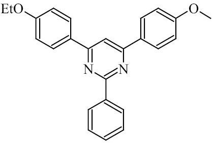 6-(4-Метоксифенил)-4-(4-этоксифенил)-2-фенилпиримидин (15). Выход 27%, т. пл. 145–146°С. ИК спектр, ν, см–1: 1609, 1589 (C=C–C=N). Спектр ЯМР 1H, δ, м. д.: 1.46 т (3H, CH3, J. 7.0 Гц), 3.90 с (3H, ОCH3), 4.13 к (2H, ОCH2, J 7.0 Гц), 6.98–7.03 м (2H, C6H4), 7.01–7.06 м (2H, C6H4), 7.43–7.53 м (3H, C6H5), 8.10 с (1Н, СН), 8.30–8.34 м (2H, C6H4), 8.33–8.37 м (2Н, C6H4), 8.63–8.68 м (2H, C6H5). Cпектр ЯМР 13С, δС, м. д.: 14.3 (CH3), 54.6 (ОCH3), 62.7 (ОCH2), 107.9 (CH), 113.5 (2CH), 113.9 (2CH), 127.6 (2CH), 127.7 (2CH), 128.3 (2CH), 128.3 (2CH), 129.0, 129.2, 129.6 (CH), 137.9, 160.6, 161.2, 162.9, 163.0, 163.1. Найдено, %: С 78.66; Н 5.72; N 7.39. C25H22N2O2. Вычислено, %: С 78.51; Н 5.80; N 7.32.