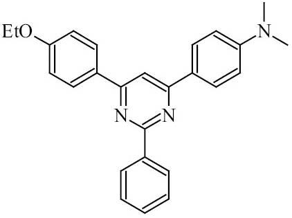 4-[6-(4-Этоксифенил)-2-фенилпиримидин-4-ил]-N,N-диметиланилин (16). Выход 32%, т. пл. 160–161°С. ИК спектр, ν, см–1: 1609, 1568 (C=C–C=N). Спектр ЯМР 1H, δ, м. д.: 1.46 т (3H, CH3, J. 7.0 Гц), 3.09 с (6H, NМе2), 4.13 к (2H, ОCH2, J 7.0 Гц), 6.80–6.86 м (2H, C6H4NМе2), 6.98–7.03 м (2H, C6H4ОEt), 7.42–7.53 м (3H, C6H5), 8.00 с (1Н, СН), 8.22–8.33 м (2H, C6H4), 8.63–8.68 м (2H, C6H5). Cпектр ЯМР 13С, δС, м. д.: 14.3 (CH3), 39.8 (NМе2), 62.7 (ОCH2), 107.0 (CH), 111.5 (2CH), 111.6, 113.9 (2CH), 127.5 (2CH), 127.7 (2CH), 127.9 (2CH), 128.2 (2CH), 129.3, 129.4 (CH), 138.1, 151.3, 160.4, 162.6, 162.7, 163.3. Найдено, %: С 78.88; Н 6.43; N 10.57. C26H25N3O. Вычислено, %: С 78.96; Н 6.37; N 10.62.