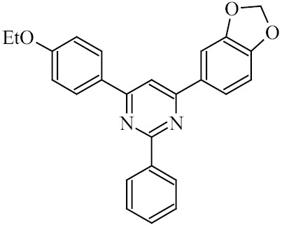 4-(1,3-Бензодиоксол-5-ил)-6-(4-этоксифенил)-2-фенилпиримидин (17). Выход 29%, т. пл. 145–146°С. ИК спектр, ν, см–1: 1609, 1573 (C=C–C=N). Спектр ЯМР 1H, δ, м. д.: 1.46 т (3H, CH3, J. 7.0 Гц), 4.13 к (2H, ОCH2, J 7.0 Гц), 6.09 c (2H, ОCH2О), 6.96 д (1H, C6H3, J. 8.1 Гц), 6.97–7.02 м (2H, C6H4), 7.43–7.53 м (3H, C6H5), 7.93 д (1H, C6H3, J. 1.8 Гц), 7.97 д. д (1H, C6H3, J. 8.1, 1.8 Гц), 8.09 с (1Н, СН), 8.31–8.36 м (2H, C6H4), 8.62–8.67 м (2H, C6H5). Cпектр ЯМР 13С, δС, м. д.: 14.3 (CH3), 62.7 (ОCH2), 100.9 (ОCH2О), 107.0 (CH), 107.7 (CH), 108.1 (CH), 113.9 (2CH), 121.4 (CH), 127.6 (2CH), 127.7 (2CH), 128.4 (2CH), 128.9, 129.7 (CH), 131.1, 137.8, 147.7, 149.3, 160.6, 162.8, 162.9, 163.2. Найдено, %: С 78.66; Н 5.72; N 7.39. C25H20N2O3. Вычислено, %: С 75.74; Н 5.08; N 7.07.