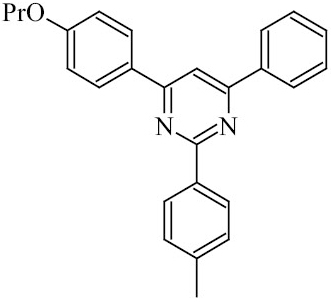 2-(4-Метилфенил)-4-фенил-6-(4-пропоксифенил)пиримидин (19). Выход 54%, т. пл. 110–111°С. ИК спектр, ν, см–1: 1605, 1586 (C=C–C=N). Спектр ЯМР 1H, δ, м. д.: 1.10 т (3H, CH3, J. 7.4 Гц), 1.80–1.92 м (2H, CH2), 2.47 с (3H, CH3Аr), 4.03 т (2H, ОCH2, J 6.5 Гц), 6.99–7.04 м (2H, C6H4ОРr), 7.26–7.31 м (2H, C6H4Ме), 7.47–7.60 м (3H, C6H5), 8.15 с (1Н, СН), 8.31–8.36 м (2H, C6H4ОРr), 8.33–8.39 м (2Н, C6H5), 8.52–8.57 м (2H, C6H4Ме). Cпектр ЯМР 13С, δС, м. д.: 10.1 (CH3), 20.9 (CH2), 21.9 (CH3), 68.7 (ОCH2), 108.5 (CH), 114.0 (2CH), 126.8 (2CH), 127.8 (2CH), 128.1 (2CH), 128.30 (2CH), 128.34 (2CH), 128.9, 129.9 (CH), 135.1, 137.0, 139.5, 160.8, 163.2, 163.34, 163.36. Найдено, %: С 81.98; Н 6.41; N 7.29. C26H24N2O. Вычислено, %: С 82.07; Н 6.36; N 7.36.