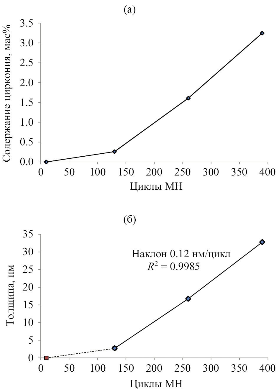 Для определения содержания циркония в синтезированных образцах проведен рентгеноспектральный микроанализ поверхности на примере модифицированных кремниевых подложек. Начиная с 130 циклов, массовая доля на поверхности заметно прямо пропорционально возрастает с увеличением количества циклов обработки (рис. 1а). На основании полученных результатов рентгеноспектрального микроанализа проведена оценка толщины синтезированных покрытий. В расчетах использована модель приповерхностной области объекта исследований в виде куба со стороной 2 мкм, соответствующей зоне возбуждения при анализе. Модель состоит из трех слоев: кремния, диоксида кремния, цирконийоксидного покрытия. Для расчета толщин использованы их объемные доли, которые были рассчитаны исходя из стехиометрического состава оксидных слоев, атомных долей элементов и плотностей слоев, принятые равными 2.32 [28], 2.1 [28] и 5.85 г/см3 [17] для кремния, оксида кремния и оксида циркония соответственно.