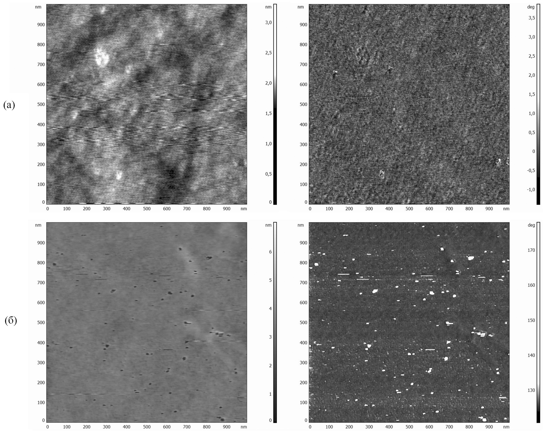 Рис. 3. АСМ реконструкция поверхности образцов кремния (а) и боросиликатного стекла (б) после проведения 10 циклов обработки в режиме топографии (слева) и фазового контраста (справа)