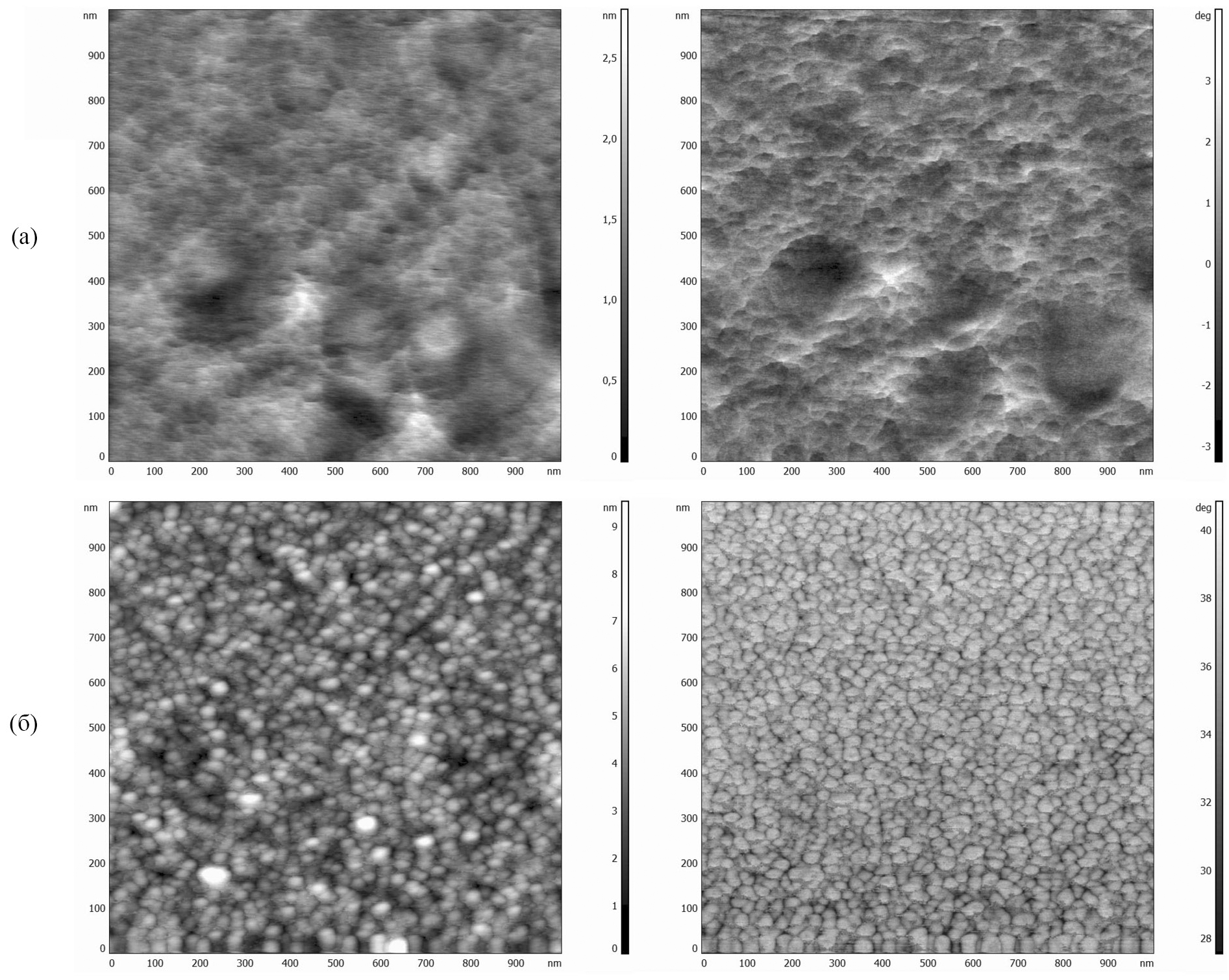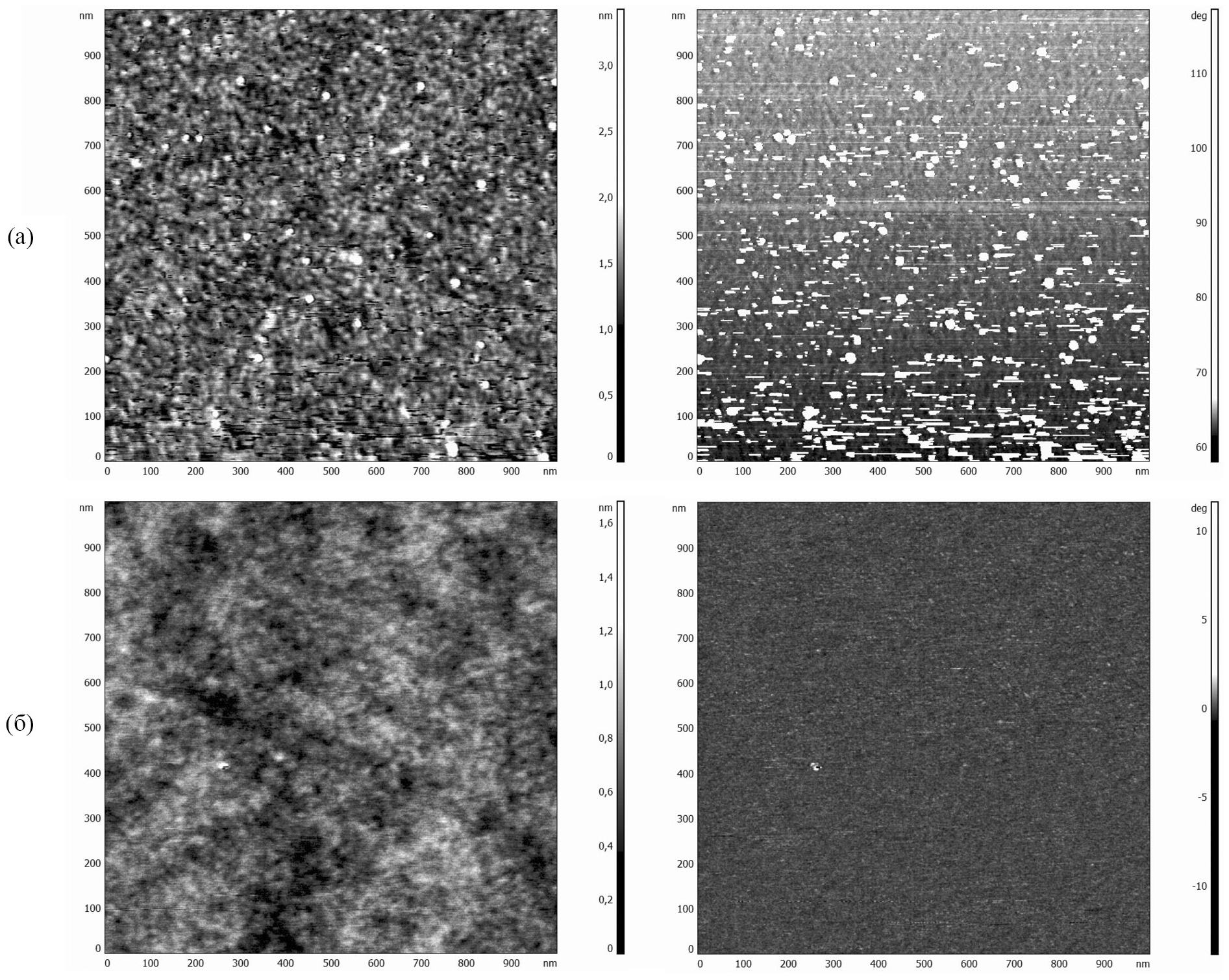 Рис. 2. АСМ реконструкция поверхности исходных подложек кремния (а) и боросиликатного стекла (б) в режиме топографии (слева) и фазового контраста (справа)