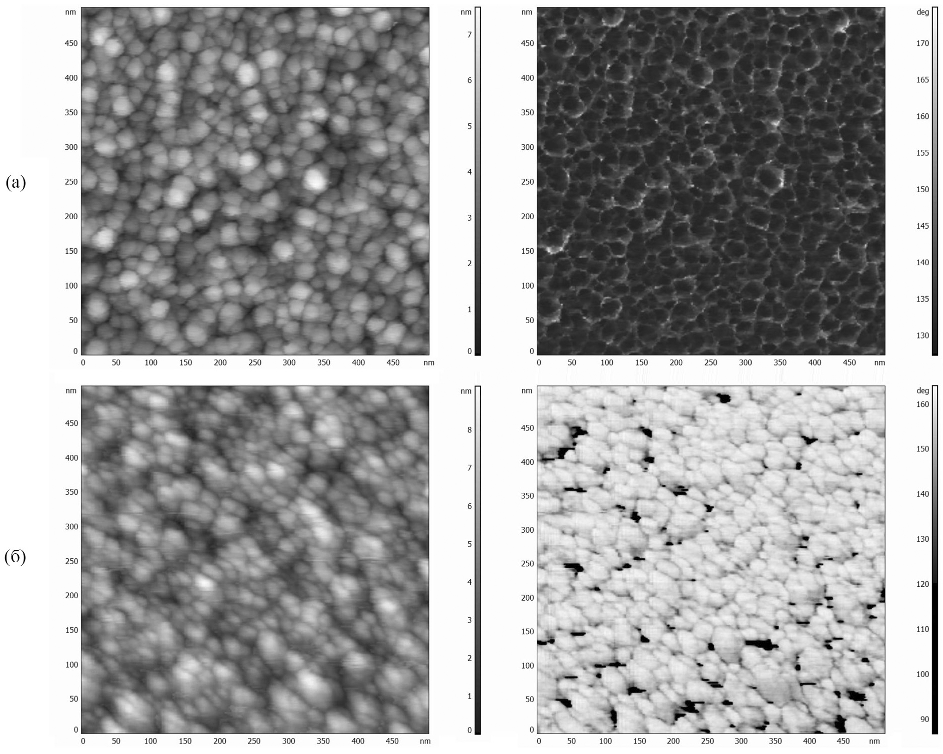 В образцах после 390 циклов обработки (рис. 6) на поверхности матриц наблюдаются сферические структуры, границы которых отчетливо видны как на АСМ-изображении топографии, так и в режиме фазового контраста. Размеры структур покрытия, образованного на кремнии, составляют 25–40 нм, а на матрице боросиликатного стекла – 10–40 нм. В режиме фазового контраста заметна неоднородность покрытия на стекле, наблюдаемая в виде резких перепадов значения рассогласования сигнала фазового контраста кантилевера на границах сфероподобных структур. По-видимому, отмеченное обусловлено заметным расстоянием между частицами, в то время как на кремнии частицы цирконийоксидной пленки прилегают плотнее друг к другу. Это может быть следствием разного химического состава поверхности и, как следствие, состава и концентрации функциональных групп поверхностей матриц. В случае с кремнием доступная для роста покрытия поверхность представляет собой однородную по химическому составу пленку естественного диоксида кремния, и формирование покрытия происходит равномерно по всей доступной поверхности. На боросиликатном стекле поверхность в разных участках может отличаться друг от друга химическим составом, например, содержанием оксида бора, что может отразиться на концентрации и химической активности функциональных групп того или иного участка поверхности. Подобные резкие перепады сигнала фазового контраста могут свидетельствовать о том, что процесс роста новых частиц на поверхности уже образованных частиц конкурирует с процессом заполнения доступной поверхности на начальном этапе, и на момент проведения 390 циклов обработки данный эффект все еще проявляется.