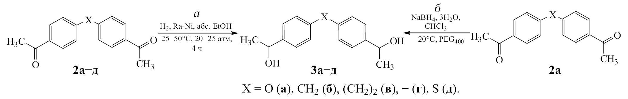 В литературе широко представлены методы гидрирования таких известных и близких по химической структуре кетонов, как ацетилбензол (ацетофенон), 1,4-диацетилбензол, 4-ацетилбифенил [26–35]. Их гидрирование проводили в присутствии как благородных (Pd, Pt), так и неблагородных (Ni, Cu, Mo, Co) металлов, нанесенных на различные подложки. Однако несмотря на структурное сходство жирноароматические дикетоны и продукты их гидрирования существенно отличаются от соответствующих монопроизводных по своим свойствам (растворимость, температура кипения и плавления, термическая стабильность и др.). Как показывают результаты наших исследований, представленных ниже (табл. 2), условия гидрирования, например, ацетофенона, обеспечивающие высокий выход 1-фенилэтанола, не могли быть просто перенесены на синтез рассматриваемых диолов и нуждались в существенной адаптации и модификации. Полученные результаты демонстрируют высокую каталитическую активность и удовлетворительную селективность (выход), проявляемую некоторыми каталитическими системами, которые содержат палладий (опыты № 9, 11, 12) и никель Ренея (опыты № 13–17). Видно, однако, что ускорение реакции, достигаемое посредством повышения (до 60–80°С) температуры (опыты № 14–16) и давления водорода (опыты № 13–16) неблагоприятно отражаются на селективности процесса гидрирования. Это связано с побочными реакциями деароматизации (гидрирования ароматических колец) [21] и гидрогенолиза [36]. Поэтому с целью нахождения более благоприятного сочетания различных факторов при получении диолов с высокими выходами и без использования дорогостоящих катализаторов (опыты № 7–12) выбраны следующие два метода (схема 3): каталитическое гидрирование дикетона в присутствии никеля Ренея (а) и его восстановление боргидридом натрия (б).