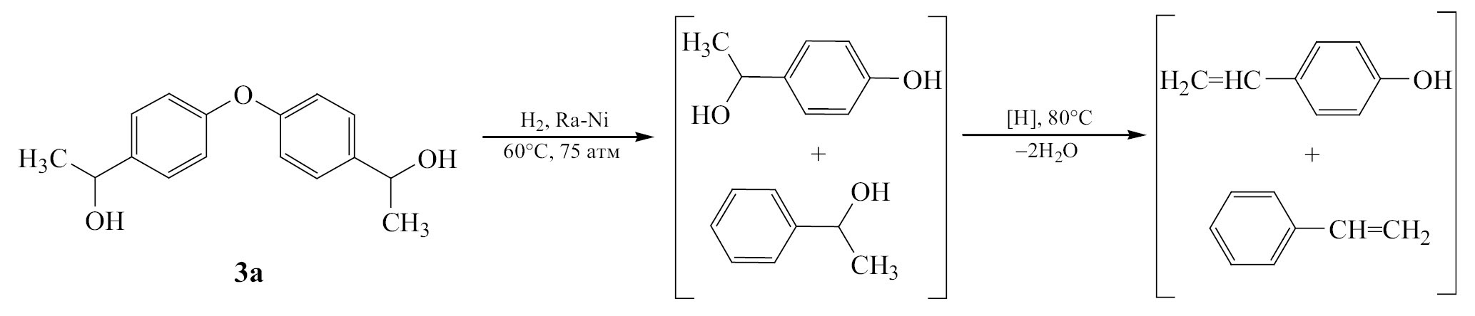 Для повышения активности катализатора и улучшения растворимости дикетона обычно повышают температуру, которая хотя и ускоряет процесс гидрирования, но одновременно благоприятствует реакции гидрогенолиза, при котором происходит расщепление, например, дифенилоксидной (дифенилсульфидной) группы в молекуле диола, и образуются соответствующие метилфенилкарбинолы (схема 4). Эти вторичные жирноароматические спирты дегидратируются при получении дивинилароматических мономеров и образуют примеси фенольного и стирольного типа, которые могут оказывать нежелательное влияние на кинетические характеристики отверждения дивинилароматических мономеров и их экологические свойства [37].