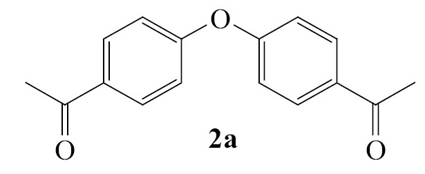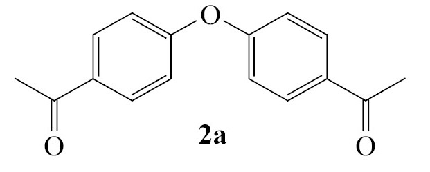Бис(4-ацетилфениловый) эфир (2а). Выход 49.84 г (98%), белый порошок, т. пл. 101–102°С. ИК спектр, ν, см–1: 1679 с (С=О), 1588 с, 1503 ср (С=С, Ar), 1420 сл, 1355 ср, 1305 ср, 1291 сл, 1257 с, 1201 ср, 1185 сл, 1164 с, 1116 ср, 1079 сл, 1027 сл, 1010 ср, 960 с, 882 сл, 848 сл, 825 с, 761 сл, 713 сл, 624 сл, 591 ср, 578 с. Спектр ЯМР 1Н (CDCl3), δ, м. д.: 2.61 c (6Н, Me), 8.01 с (4Н, Нo-Ar), 7.10 с (4Н, Нм-Ar). Найдено, %: C 75.47; Н 5.50. C16H14O3. Вычислено, %: C 75.57; Н 5.55.