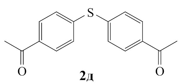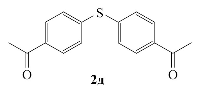 Бис(4-ацетилфенил)сульфид (2д). Выход 46.5 г (86%), белый порошок, т. пл. 88°C (т. пл. 89–90°C [19, 23]). ИК спектр, ν, см–1: 1677 с (С=О), 1584 с, 1561 ср, 1486 сл, 1426 сл, 1397 с, 1353 с, 1305 сл, 1284 ср, 1181 с, 1110 ср, 1089 ср, 957 ср, 854 сл, 821 с, 757 ср, 715 сл. Спектр ЯМР 1Н (CDCl3), δ, м. д. (J, Гц): 2.61 c (6Н, Me), 7.92 д (4Н, Нo-Ar, J 2.5), 7.43 д (4Н, Нм-Ar, J 2.5).