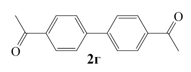 Бис(4-ацетилбифенил) (2г). Выход 46.46 г (97.5%), белый порошок т. пл. 193–194°С (толуол). ИК спектр, ν, см–1: 1677 (С=О), 1603, 1554, 1419, 1395, 1357, 1310, 1262, 1185, 1120, 1083, 1004, 960, 898, 830, 817, 767, 728. Спектр ЯМР 1Н (CDCl3), δ, м. д. (J, Гц): 2.67 c (6Н, Me), 8.08 д (4Н, Нo-Ar, J 2.5), 7.74 д (4Н, Нм-Ar, J 2.5). Спектральные данные хорошо согласуются с ранее приведенными данными [41].