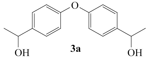 Гидрирование жирноароматических дикетонов 2а, б, г в этаноле в присутствии никелевых и палладиевых катализаторов на различных носителях. а. Катализатор Ni/Cr2O3 (опыт № 6). Смесь 3.0 г Ni/Cr2O3 (паста в этаноле), 75 мл этанола и 10 г дикетона 2а нагревали (40–50°C) в автоклаве при перемешивании и давлении водорода 100–60 атм. После прекращения поглощения водорода (~2 ч) катализатор отделяли центрифугированием, этанол отгоняли при пониженном давлении, остаток перекристаллизовывали из толуола. Выход бис[4-(1-гидроксиэтил)фенилового]эфира 3а составил 5.1 г (50%).