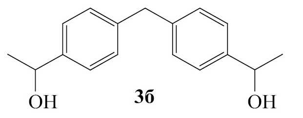 Бис[4-(1-гидроксиэтил)фенил]метан (3б). Выход 106.4 г (83%), т. пл. 84.5–86.5°C (гексан–толуол, 1:2) [17]. Найдено, %: C 80.20; Н 7.96. C17H20O2. Вычислено, %: C 79.70; Н 7.86. Содержание гидроксильных групп: найдено, %: 13.1; вычислено, %: 13.3.