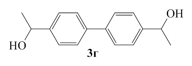 Бис[4-(1-гидроксиэтил)бифенил] (3г). Выход 105.4 г (87%), т. пл. 158.0–159.5°C (гексан–толуол, 1:2) [18]. ИК спектр, ν, см–1: 3550–3100, 3070, 3050, 3025, 2975, 2925, 2880, 1610, 1595, 1455, 1445, 1390, 1370, 1345, 1320, 1305, 1285. 1260, 1205, 1120, 1085, 1070, 1030, 1005, 945, 895, 845, 820, 790, 760, 730. Найдено, %: C 79.20; Н 7.40. C16H18O2. Вычислено, %: C 79.30; Н 7.50. Содержание гидроксильных групп, определенное методом ацетилирования: найдено, %: 13.3; вычислено, %: 14.0.