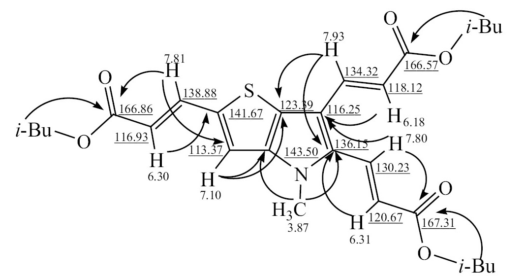 Структура соединения 4 установлена по данными спектроскопии ЯМР 1Н и 13С с привлечением двумерных 1H–13C и 1H–15N HSQC, HMBC, 1H–1H COSY-DQF и NOESY спектров высокого разрешения, а также данными масс-спектра, где имеется пик молекулярного иона при 516. Согласно данным ЯМР, в спектрах наблюдаются сигналы трех изобутилакрилатных заместителей с транс-ориентацией протонов двойных связей, что подтверждается дублетными сигналами с величиной КССВ, равной 15.6–16.0 Гц, а спиновые партнеры протонов двойных связей однозначно установлены с помощью спектроскопии COSY-DQF. Замещение изобутилакрилатными группами в положениях C2, C5 и C6 в 4Н-тиено[3,2-b]пирроле установлено на основании корреляций в спектре 1H–13C HMBC. Так, для протонов в положениях 2 акрилатных остатков (δH 6.30, 6.31 и 6.18 м. д.) наблюдаются HMBC кросс-пики с позициями замещения C2 (δС 141.67), C5 (δС 136.15) и С6 (δС 116.25 м. д.) соответственно. Кроме того, для протонов в положениях 3 акрилатных остатков (δH 7.81, 7.80 и 7.93 м. д.) наблюдаются HMBC-корреляции через три связи с соседними положениями к позициям замещения C3 (δС 113.37 м. д.), C6 (δС 116.25 м. д.) и C6a (δС 123.39 м. д.) соответственно. Также для этих протонов наблюдаются кросс-пики с карбоксильными функциями акрилатов, с которыми, в свою очередь, коррелируют метиленовые протоны для трех изобутилакрилатных заместителей (схема 2).