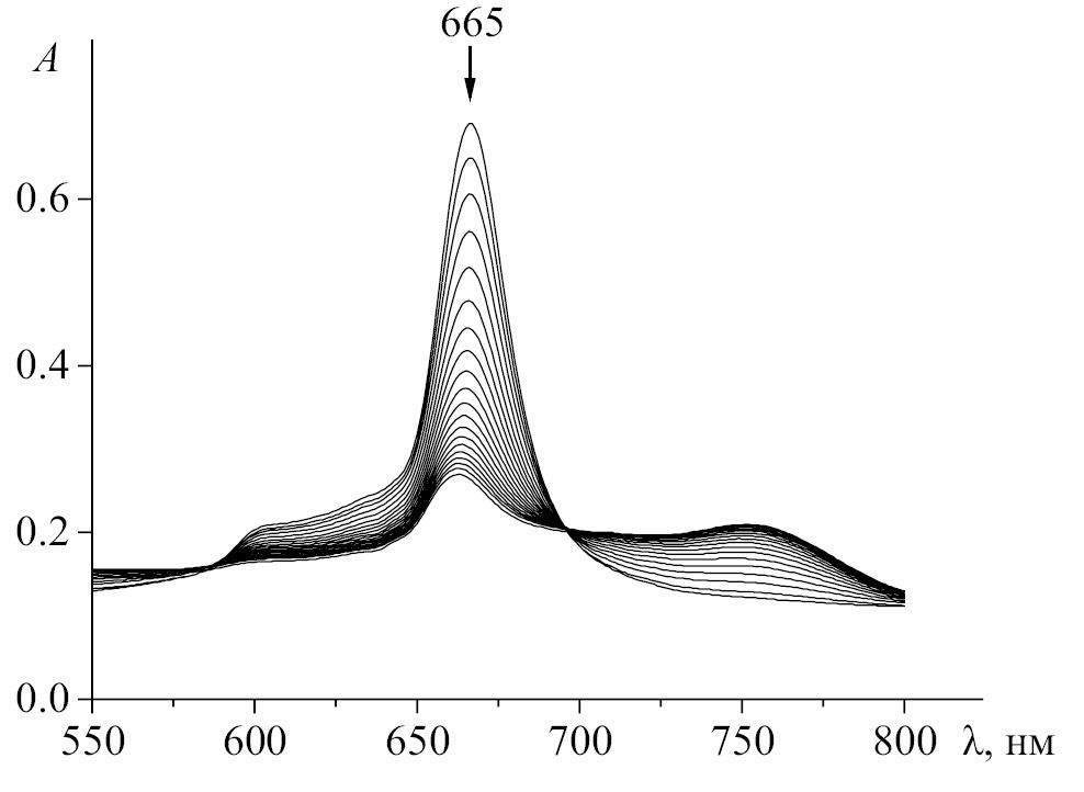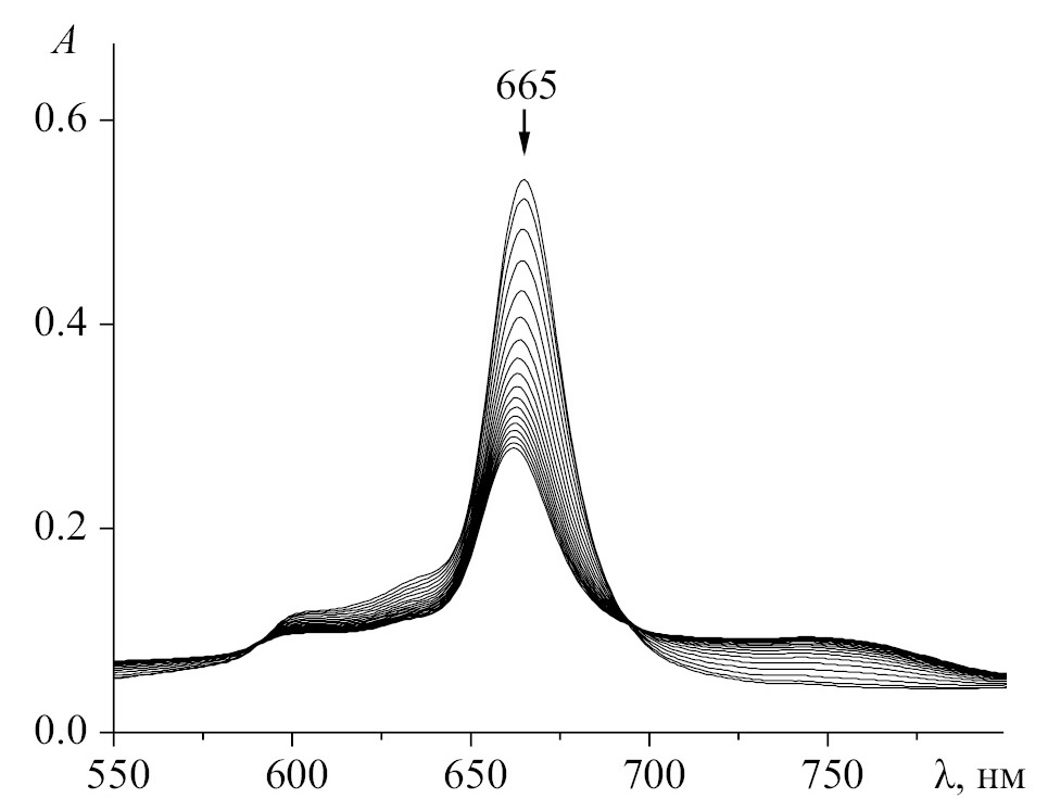 Дальнейшие исследования показали, что комплекс H2PA(Pyz)4R8∙2MePy теряет свою кинетическую устойчивость при введении в 2-метилпиридин добавок морфолина (пиперидина, н-бутиламина, диэтиламина). В электронном спектре поглощения с течением времени регистрируется уменьшение интенсивности нерасщеленной Q-полосы с λ 665 нм независимо от природы основания (рис. 3, 4). При этом исчезает В-полоса, характеризующая наличие пиррольных фрагментов в макроцикле, а цвет раствора изменяется от ярко-зеленого до бесцветного.