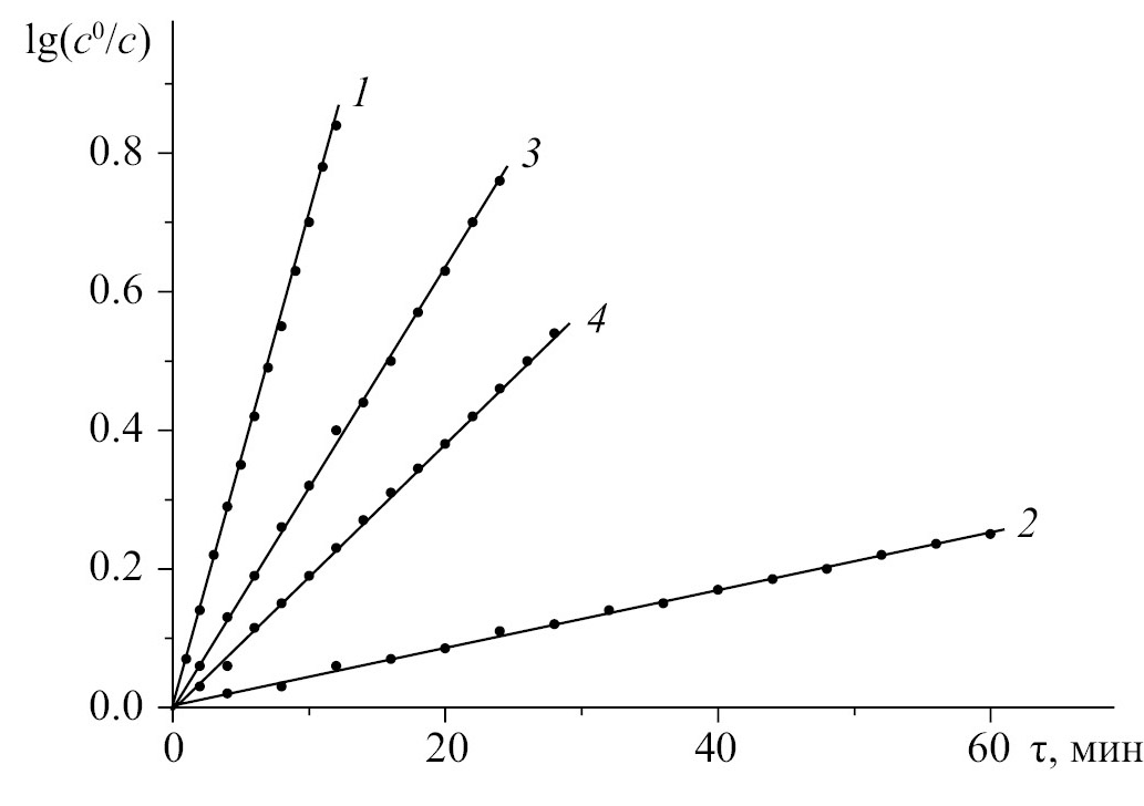 Точность кинетических параметров оценивали с помощью обычных методов статистики при доверительном интервале 95%. Использование метода Стьюдента позволило определить относительные ошибки в зачениях kн и Еа, которые составили не более 4.2 и 7.5% соответственно.