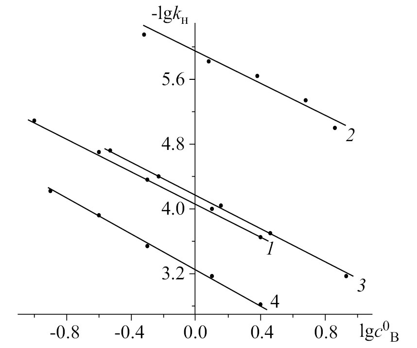 Рис. 6. Зависимость lgkн от lgc0 B реакции деструкции H2PA(Pyz)4R8∙2MePy в присутствии BuNH2 (1), Et2NH (2), Morph (3), Pip (4) в 2-метилпиридине при Т = 298 (1), 303 (2), 308 (3) и 318 K (4).