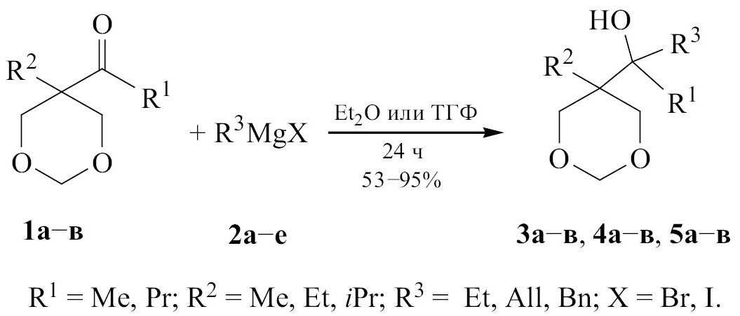 Установлено, что взаимодействие 5-ацил-1,3-диоксанов 1а–в с избытком магнийорганического соединения 2а–е в диэтиловом эфире или ТГФ в течение 24 ч (схема 1) протекает с восстановлением карбонильной группы и приводит к образованию соответствующих третичных спиртов 3–5 (табл. 1).