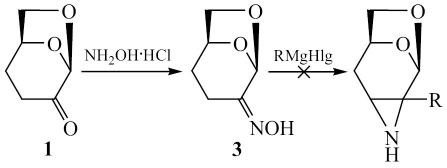 Известно, что при взаимодействии арилалкилкетоксимов с ароматическими или алифатическими реактивами Гриньяра образуются азиридины [26]. В продолжение исследований для синтеза хиральных азиридинов на основе цирена 1 мы воспользовались этим методом. Оксим цирена 3 получали по известной методике кипячением в пиридине цирена 1 с NH₂OH·HCl [27]. К сожалению, все наши попытки провести циклизацию под действием CH₃MgI, C²H₅MgBr, C¹²H²₅MgBr оказались безуспешными, исходный оксим 3 оставался инертным (схема 2).