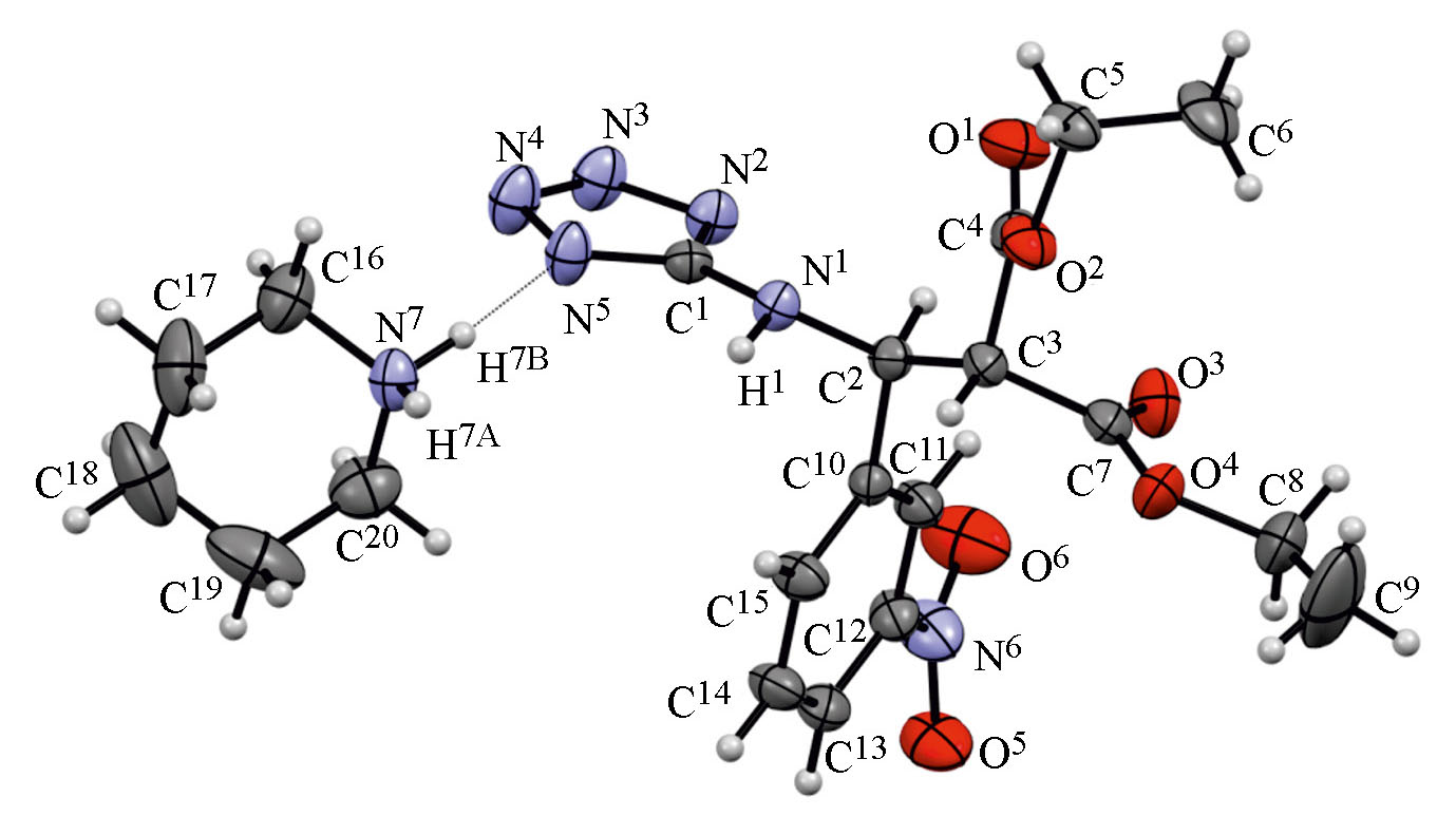 5-[1-(4-Нитрофенил)-3-этокси-2-этоксикарбонил-3-оксопропил]аминотетразол-1-ид пиперидиния (4). В реакции использовали 4-нитробензальдегид. Выход 2.41 г (52%), т. пл. 127–129°C. ИК спектр, ν, см⁻¹: 1628 (C=C), 1723, 1742 (C2H5OCO), 3218, 3330, 3361 (NH, N+H).Спектр ЯМР 1H, δ, м. д.: 0.94 т (3H, CH3CH2OCO, J 8.0 Гц), 1.14 т (3H, CH3CH2OCO, J 8.0 Гц), 1.59 м (6H, C5H10NH2), 2.96 м (4H, С5H10NH2), 3.90 к (2H, CH3CH2OCO, J 8.0 Гц), 4.12 д (1H, NH, J 12.0 Гц), 4.16 м (2H, CH3CH2OCO), 5.37 т (1H, C1H, J 12.0 Гц), 6.34 д (1H, С2H, J 12.0 Гц), 7.73 д (2H, ArH, J 8.0 Гц), 8.13 д (2H, ArH, J 8.0 Гц). Найдено, %: С 51.62, 52.10; Н 6.21, 6.38; N 21.01, 21.38. C20H29N7O6. Вычислено, %: С 51.83; Н 6.31; N 21.15.