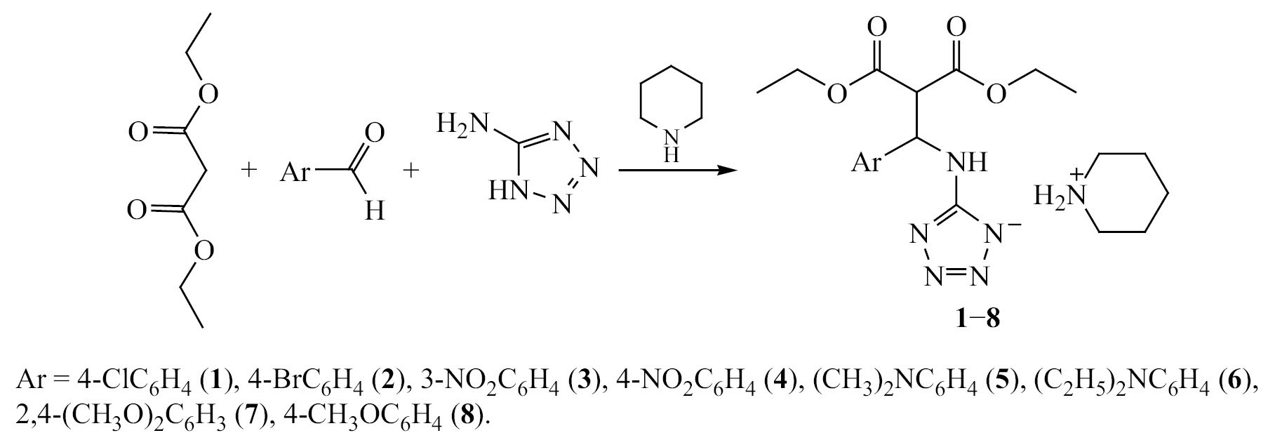 С целью получения новых производных малонового эфира, установления их пространственного строения взаимодействием диэтилмалоната с ароматическими альдегидами и 5-аминотетразолом в присутствии пиперидина нами осуществлен синтез новых 5-(1-арил-3-этокси-2-этоксикарбонил-3-оксопропил)аминотетразол-1-идов пиперидиния 1–8 (схема 1). Реакции проводили при кипячении реагентов в этаноле в течение 4 ч.