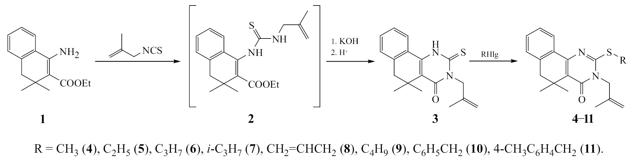1-Амино-3,3-диметил-3,4-дигидронафталин-2-карбоксилат (аминоэфир) [19] в среде этанола введен во взаимодействие с 2-метилаллилизотиоцианатом. При проведении реакции в течение 18–20 ч образовавшаяся тиомочевина 2 уже в условиях реакции частично циклизуется в 5,5-диметил-3-(2-метилаллил)-2-тиоксо-2,3,5,6-тетрагидробензо[h]хиназолин-4(1H)-он 3 (в соотношении 1:1). Для повышения выхода соединения 3 реакционную смесь обрабатывали раствором едкого кали, что приводило к получению тиоксобензохиназолина 3 с выходом 38%. Алкилированием тиоксобензохиназолина 3 в присутствии едкого кали галогенидами различного строения в среде абсолютного этанола синтезированы 2-алкилсульфанил-5,5-диметил-3-(2-метилаллил)-5,6-дигидробензо[h]хиназолин-4(3H)- оны 4–11 (схема 1).