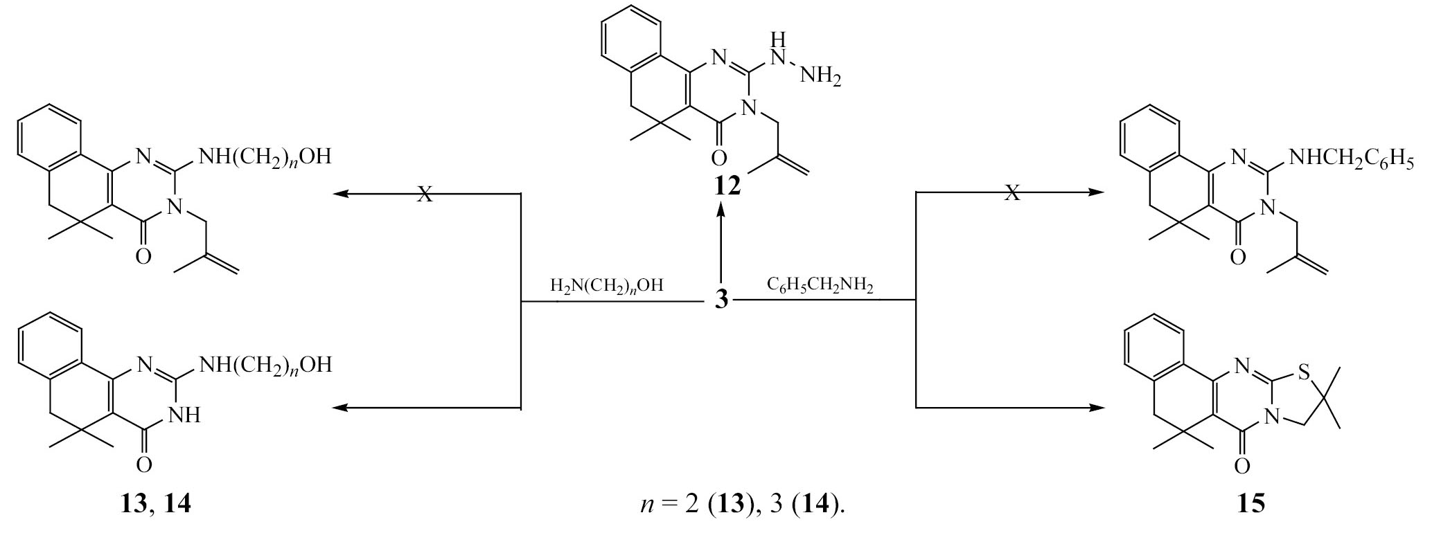 Взаимодействие тиоксобензохиназолина 3 с аминосоединениями в избытке гидразина завершается в течение 4 ч образованием 2-гидразинил-5,5-диметил-3-(2-метилаллил)-5,6-дигидробензо[h]хиназолин-4(3H)-она 12 с выходом 88% (схема 2). Аналогичные реакции тиоксобензохиназолина 3 с 2-этаноламином и 3-пропаноламином при температуре кипения последних протекали аномально. Вместо ожидаемых 2-(2-гидроксиэтил)амино-3-(2-метилаллил)-5,5-диметил-5,6-дигидробензо[h]хиназолин-4(3H)-она и 2-(3-гидроксипропил)амино-3-(2-метилаллил)-5,5-диметил-5,6-дигидробензо[h]хиназолин-4(3H)-она были получены продукты расщепления – 2-(2-гидроксиэтил)амино-5,5-диметил-5,6-дигидробензо[h]хиназолин-4(3H)-он 13 без 2-метилаллильных групп. Соединение 13 нами было получено также ранее конденсацией 5,5-диметил-2-тиоксо-2,3,5,6-тетрагидробензо[h]хиназолин-4(1H)-она с 2-этаноламином [20], 2-(3-гидроксипропил)амино-5,5-диметил-5,6-дигидробензо[h]хиназолин-4(3H)-он 14 получен в настоящей работе впервые. В результате взаимодействия соединения 3 с избытком бензиламина при температуре кипения последнего вместо ожидаемого 2-бензиламино-3-(2-метилаллил)-5,5-диметил-5,6-дигидробензо[h]хиназолин-4(3H)-она был получен продукт внутримолекулярной циклизации исходного тиоксобензохиназолина – 6,6,10,10-тетраметил-9,10-дигидро-5H-бензо[h]тиазоло[2,3-b]хиназолин-7(6H)-он 15 (схема 2). В масс-спектре соединения 15 масса молекулярного иона соответствует рассчитанному.