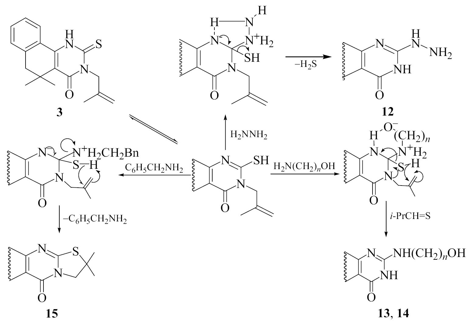 Первой общей стадией всех превращений, очевидно, является присоединение амина по связи С=N тиольного таутомера соединения 3. Дальнейшие превращения аддукта определяются природой заместителя у атома азота: для гидразина – это замещение тиольной группы, для аддукта с бензиламином с наиболее основным атомом азота N¹ – это внутримолекулярная циклизация с последующим отщеплением бензиламина, выступающего как катализатор, для аддуктов с алканоламинами, в которых возможен перенос протона от гидроксила на атом азота N¹, реализуется перестройка с последующим разрывом связей C–S и C–N¹ и отщеплением тиоизобутиральдегида или продуктов его распада и, после таутомеризации, образованием продуктов 13 и 14 (схема 3).
