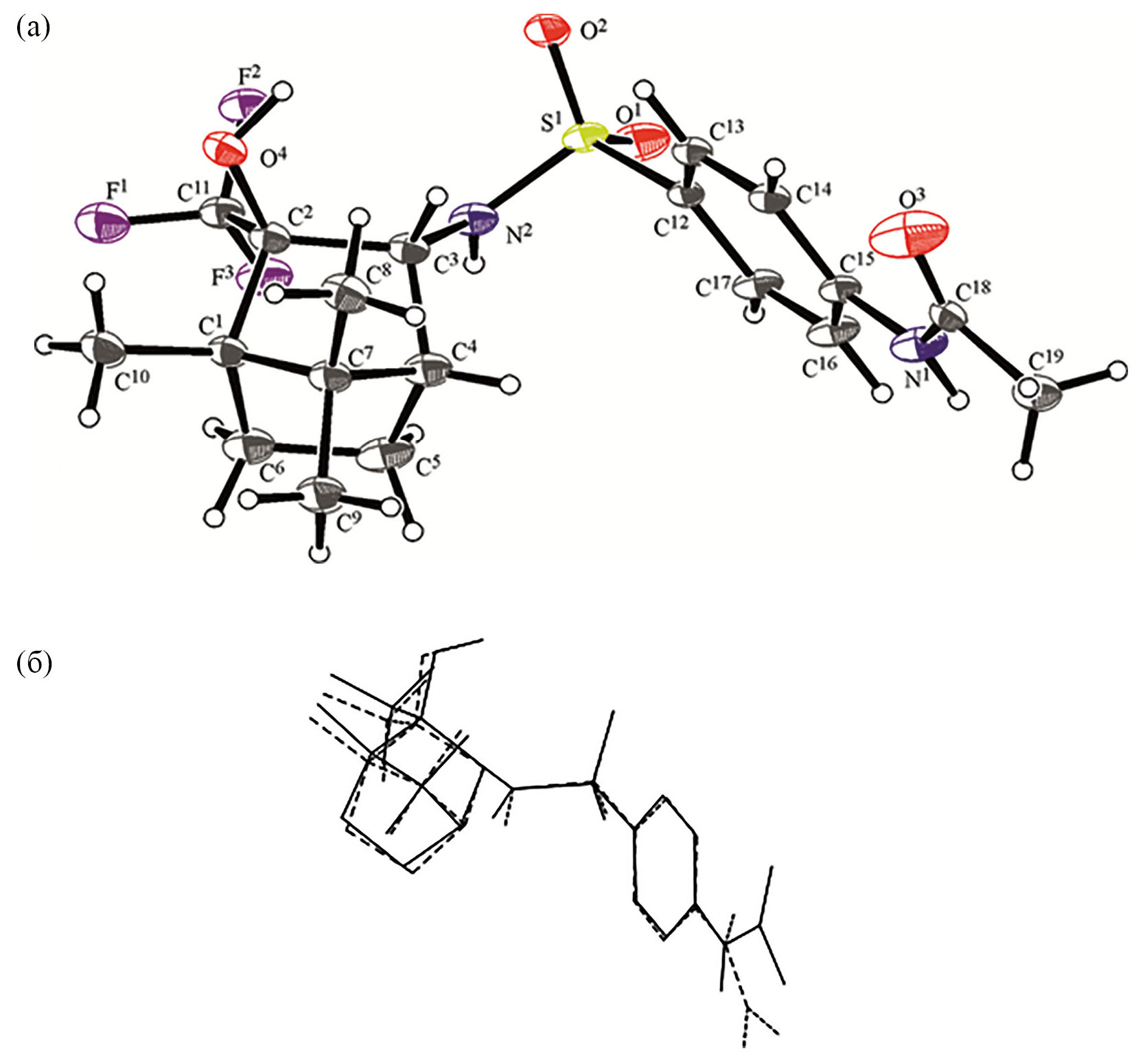 N-[4-(N-{(1R,2R,3R,4S)-3-Гидрокси-4,7,7-триметил-3-(трифторметил)бицикло[2.2.1]гептан-2-ил}сульфамоил)фенил]ацетамид (12е). Выход 45%, желтоватые кристаллы, т. разл. 242°С, [α]2D6 24.6 (c = 0.7, MeOH). ИК спектр, ν, см–1: 3534 (NHC=O), 3329 (OH), 3306 (NHSO2), 1690 (CONH), 1317, 1155 (SO2). Спектр ЯМР 1H (CD3OD), δ, м. д. (J, Гц): 0.84 с (3H, C8H3), 0.97 c (3H, C10H3), 1.14 c (3H, C9H3), 1.14–1.20 м (1H, C4H), 1.46–1.73 м (4H, C5Hα, C5Hβ, C6Hα, C6Hβ), 2.21 c (3H, CAcH3), 4.03 д (1H, C3H, J 3.0), 7.78–7.88 м (4H, CArH). Спектр ЯМР 13C (CD3OD), δC, м. д.: 11.6 (C10), 19.7 (C5), 20.5 (C8), 21.1 (C9), 24.2 (CAc), 29.8 (C6), 43.5 (С7), 50.2 (C4), 53.9 (C1), 65.1 (С3), 83.6 к (C2, JF 24.3), 120.5 (2СAr), 127.5 к (C10, JF 288.6), 129.2 (2СAr), 137.4 (CArS), 144.2 (CArN), 172.1 (CAc). Спектр ЯМР 19F (CD3OD), δF, м. д.: ‒68.2 (CF3). Найдено, %: C 52.59; H 5.81; N 6.48; S 7.31. C19H25F3N2O4S. Вычислено, %: C 52.53; H 5.80; N 6.45; S 7.38.