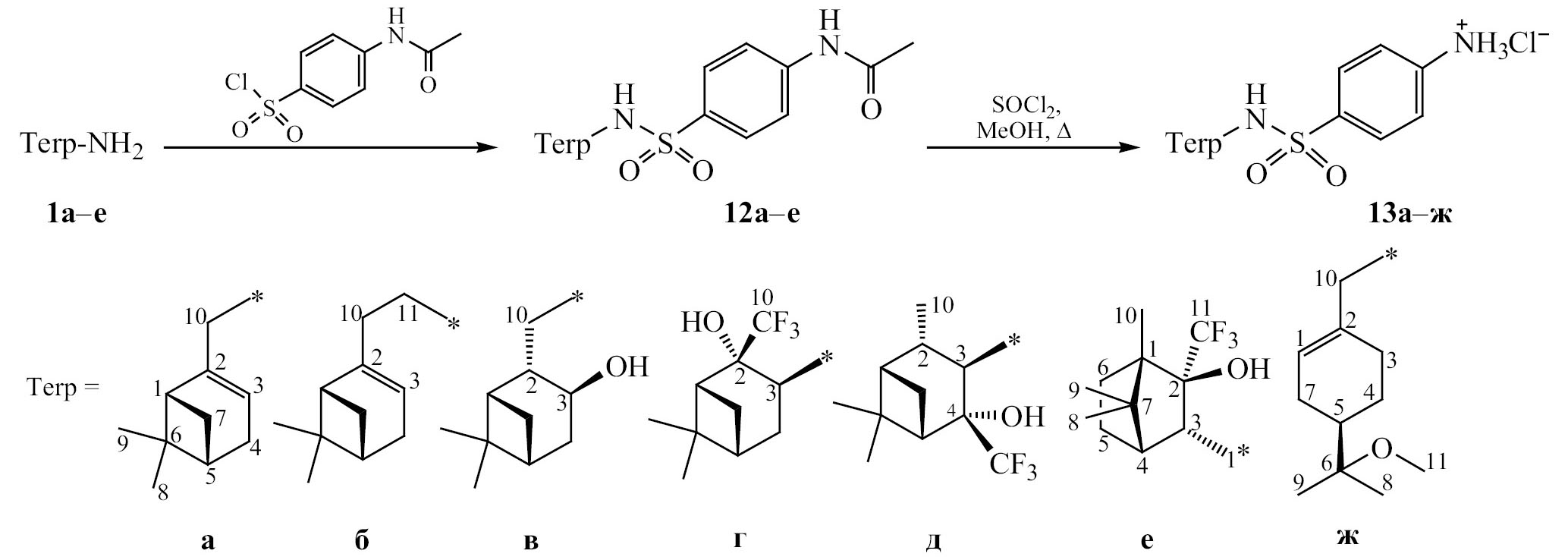 Необходимость поиска новых сульфаниламидных производных вызвана приобретаемой микроорганизмами резистентностью к известным препаратам. Последние исследования [1, 2] по синтезу и биологической активности сульфонамидов на основе сульфаниловой кислоты (п-аминобензолсульфокислоты) посвящены, в основном, арил- и гетерилсульфонамидам, содержащим различные функциональные группы. Работ по сульфонамидам на основе терпеноидов крайне мало. При этом использование доступного растительного сырья для синтеза новых биоактивных веществ является перспективным, так как терпены обладают природной хиральностью и биологической активностью [3].