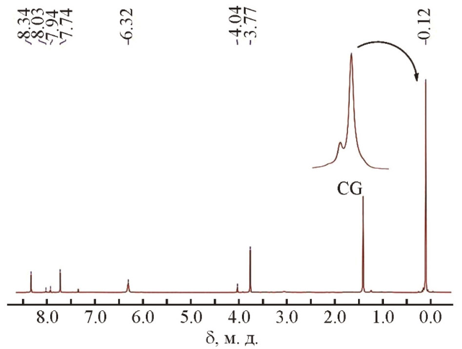 Второй продукт, полученный в результате взаимодействия аденина с (хлорметил)триметилсиланом, является N³- либо N⁷-[(триметилсилил)метил]аденином (на схеме 3 соединения 3 и 4 соответственно). Уверенно идентифицировать это соединение не удалось из-за его низкой концентрации в растворе. Сравнение положения сигналов протонов H², H⁸ в спектрах ЯМР ¹H этого соединения и региоизомеров N¹-, N³-, N⁷- и N⁹-метиладенинов (табл. 1, [53]) позволяет предположить, что минорное соединение 3 является N⁷-[(триметилсилил)метил]аденином.