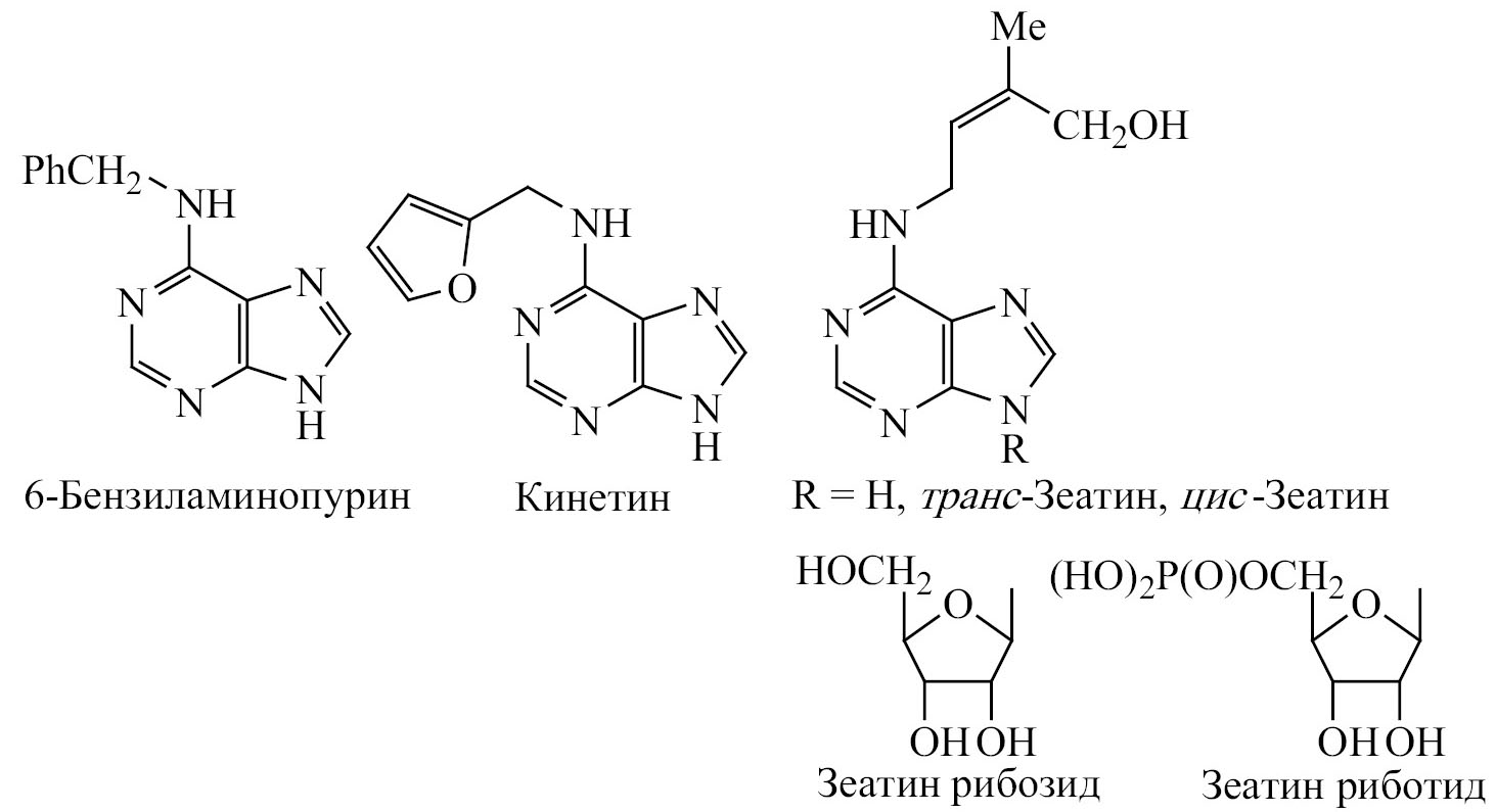 Аденин (6-аминопурин) – азотсодержащий гетероцикл, производное пурина – является одним из ключевых фрагментов, входящих в состав как ДНК, так и РНК, с его участием протекают биохимические процессы в живых организмах. Природные N6-замещенные аденины являются фитогормонами (цитокининами) и регулируют рост и развитие растений. В эту группу входят 6-бензиламинопурин, кинетин, зеатины и др. (схема 1) [1–7].