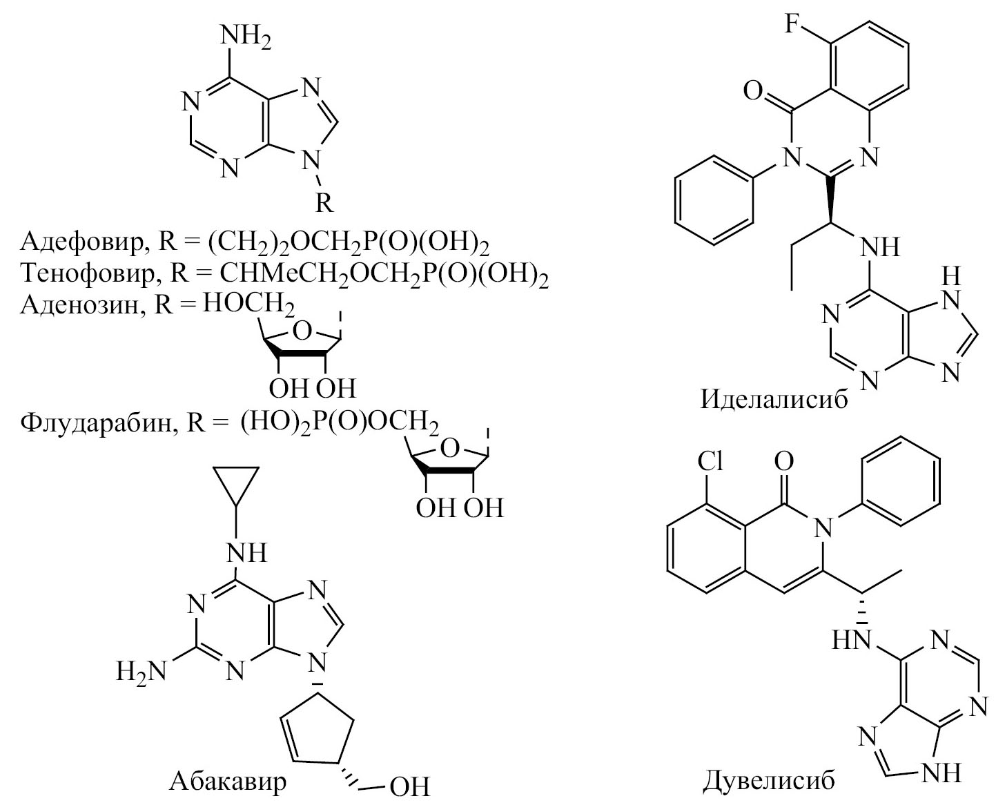 Соединения, содержащие адениновый фрагмент, широко используются в медицинской практике. В частности, их применяют в качестве агонистов и антагонистов аденозиновых рецепторов, ингибиторов ферментов, противовирусных, противотуберкулезных, противоопухолевых средств, некоторые из этих соединений приведены на схеме 2.