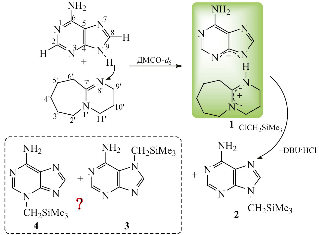 Аденин в присутствии DBU реагирует с (хлорметил)триметилсиланом. Реакция протекает в ДМСО при комнатной температуре. Мониторинг реакции методом спектроскопии ЯМР ¹H показывает, что в этих условиях реакция завершается через 96 ч. После обработки реакционной смеси выделена смесь двух продуктов в соотношении ~ 12:1 (судя по соотношению интегральных интенсивностей в спектрах ЯМР ¹H, схема 3, рис. 1).