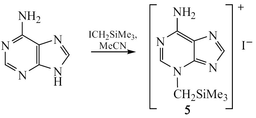 (Хлорметил)триметилсилан в отсутствие основания не реагирует с аденином даже при длительном нагревании, однако (иодметил)триметилсилан взаимодействует с аденином образуя иодид N³-[(триметилсилил)метил]аденина 5 (схема 4).