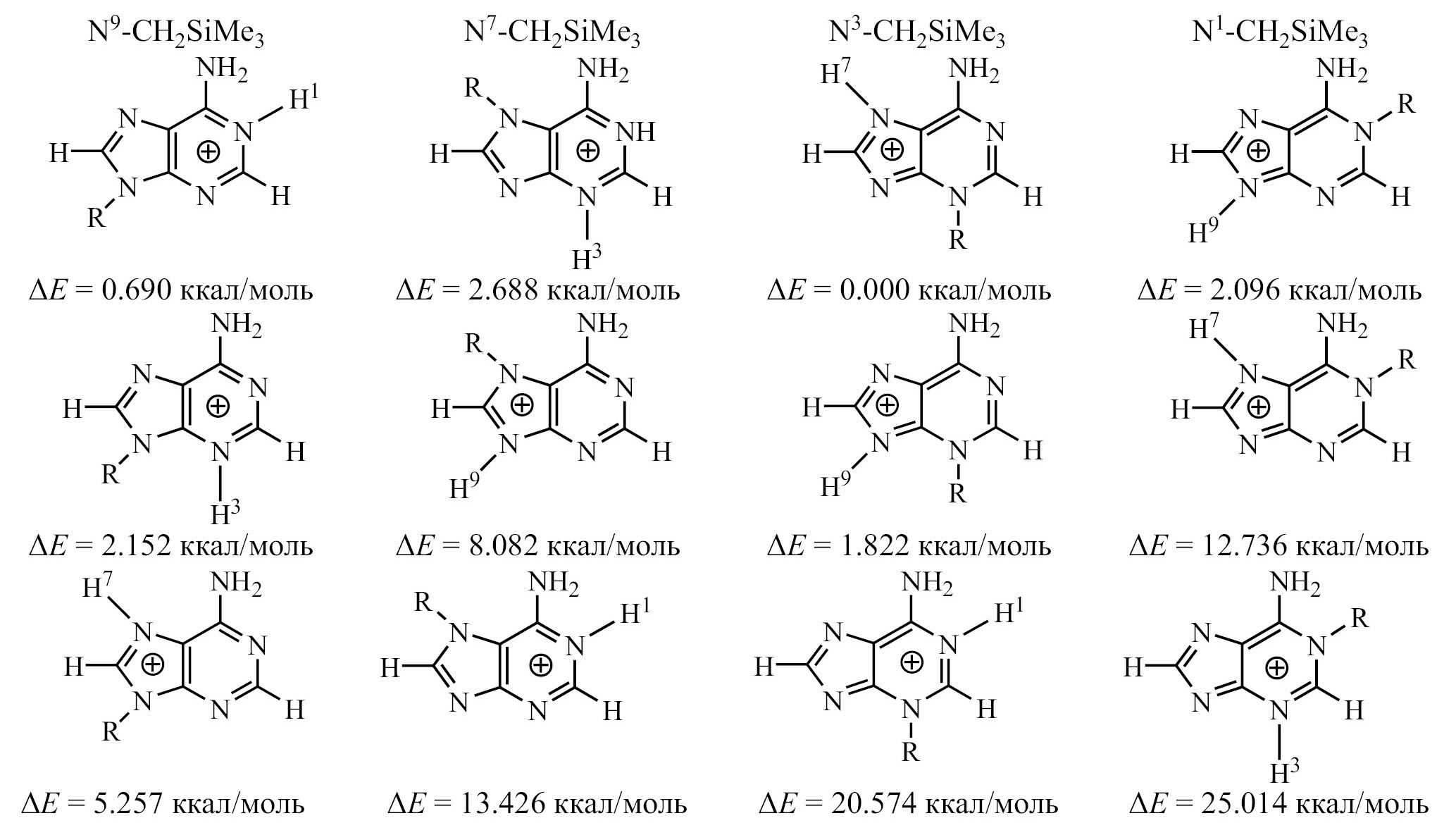 Химические сдвиги сигналов протонов H² и H⁸ в спектре ЯМР ¹H соединения 5 смещены в слабое поле по сравнению с нейтральными N³-метил- и N³-бензиладенинами [53, 54], как и в спектре иодида N³-(2-оксопропил)аденина [55] (табл. 1). Химические сдвиги углеродов C², C⁴, C⁵, C⁶ и C⁸ в спектрах ЯМР ¹³C и азота N³ в спектрах ЯМР ¹⁵N (табл. 2) этих двух солей близки. Как уже отмечено выше, алкилирование в присутствии основания приводит к образованию смеси региоизомеров. Экспериментально показано, что при алкилировании в нейтральных условиях преимущественно образуются N³-алкилированные соли аденина. Однако в зависимости от строения алкилирующего реагента и внешних факторов в реакционной смеси могут присутствовать и другие региоизомеры [47]. Выполненное квантово-химическое исследование таутомерных катионов N¹-, N³-, N⁷- и N⁹-[(триметилсилил)метил]аденинов показало, что наиболее стабилен катион N³-(триметилсилил)метил-7Н-аденина (схема 5). Эти результаты подтверждают экспериментальные данные.