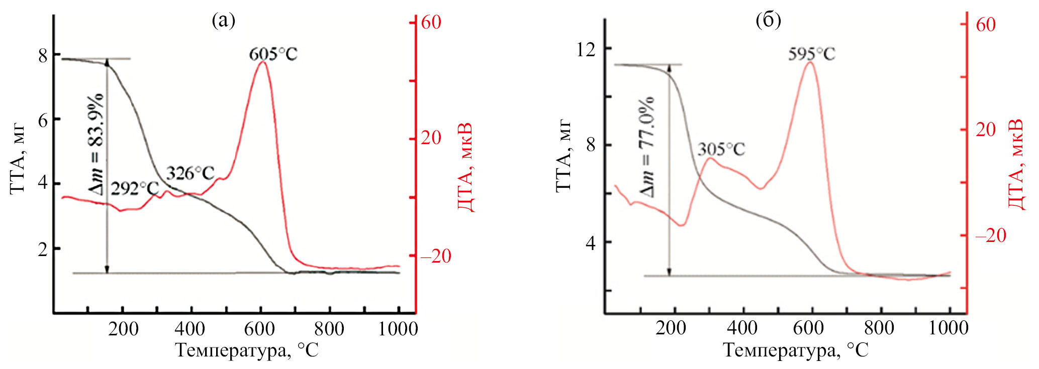 Рис. 5. Термограммы продуктов, полученных после извлечения алюминия в растворе толуола (а) и хлороформа (б).