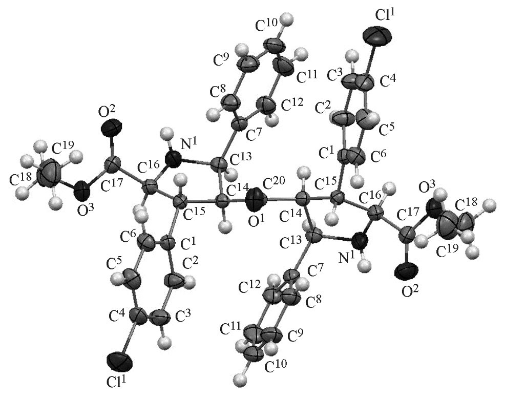 Рис. 1. Пространственное строение (2S*,2′S*,3R*,3′R*, 4S*,4′S*,5R*,5′R*)-диэтил-4,4′-карбонилбис(5-фенил-3-(4-хлорфенил)пирролидин-2-карбоксилата) 6а по данным РСА.