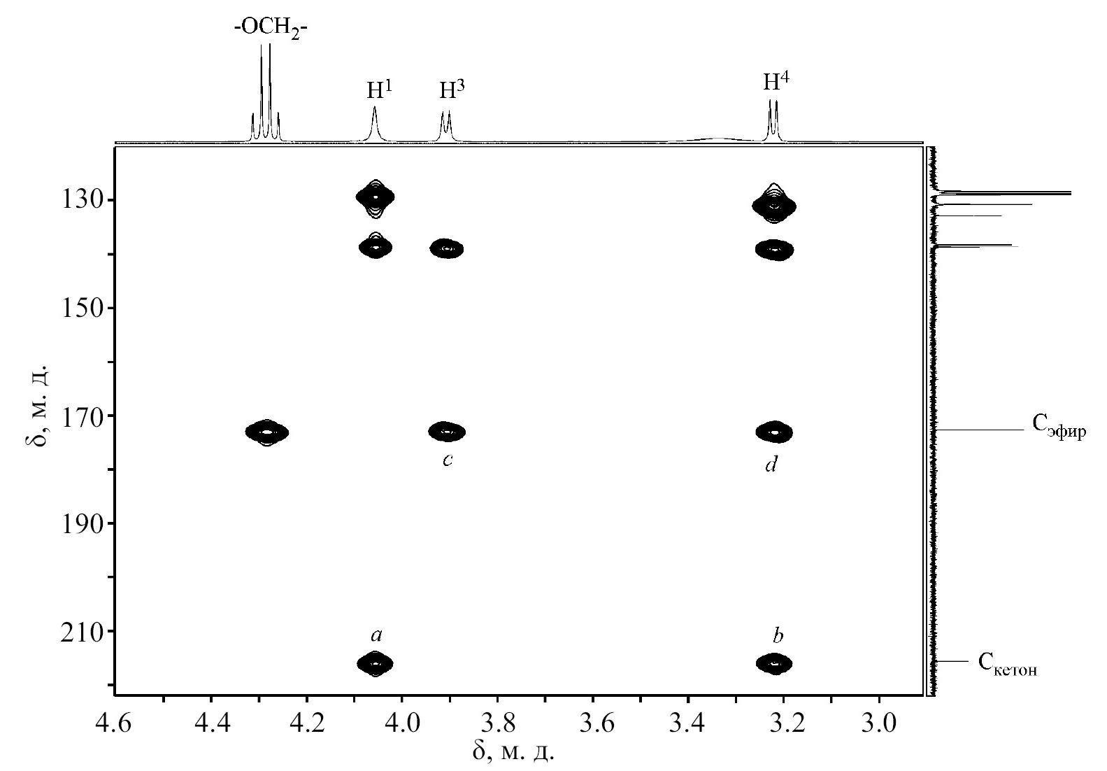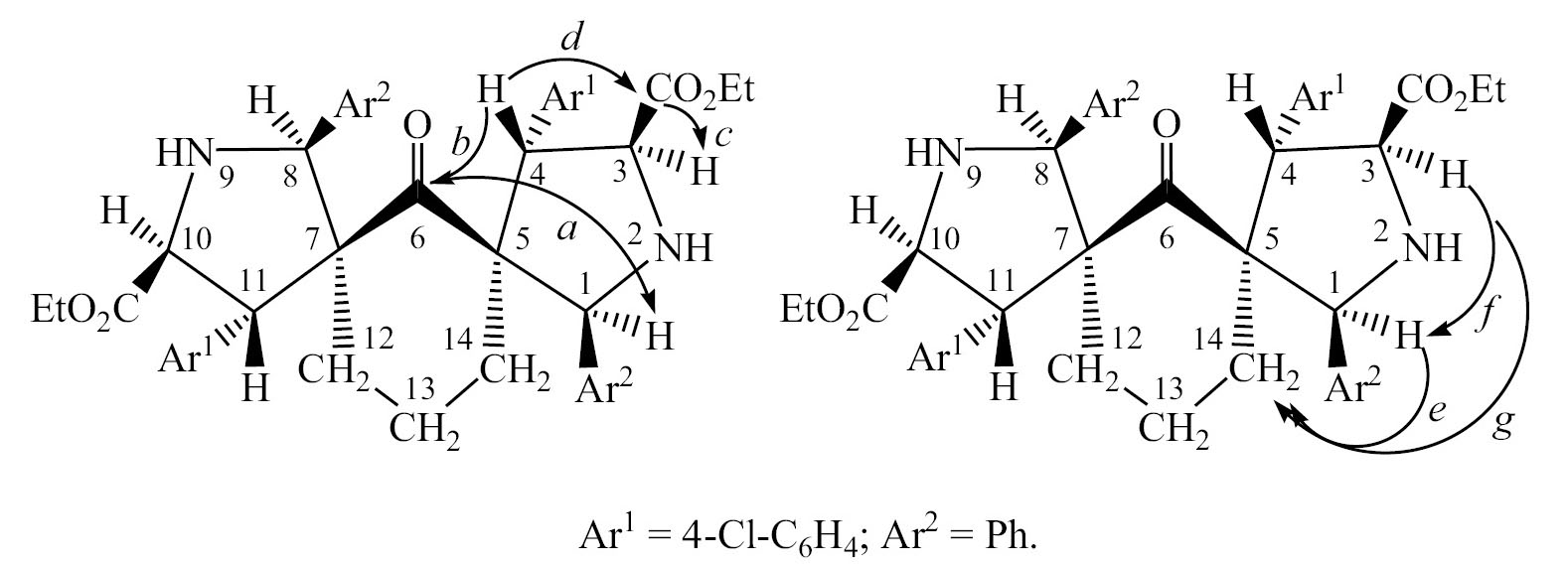 По наличию двух характерных кросс-пиков с атомом азота пирролидинового цикла в спектре 1H–15N HMBC определяли сигналы протонов Н1 и Н3. Далее, на основании 1H–13C HMBC, определяли региоселективность реакции (схема 5, на примере одного из энантиомеров соединения 12а). Для кето-группы характерны взаимодействия третьего порядка между углеродом C=О и протонами Н1 и Н4 (a и b соответственно), а для сложноэфирной группы – взаимодействия второго и третьего порядков с дублетами Н3 и Н4 (c и d соответственно). Положение арильных заместителей определяли аналогично рассмотренным ранее производным арилиденацетонов (рис. 4).