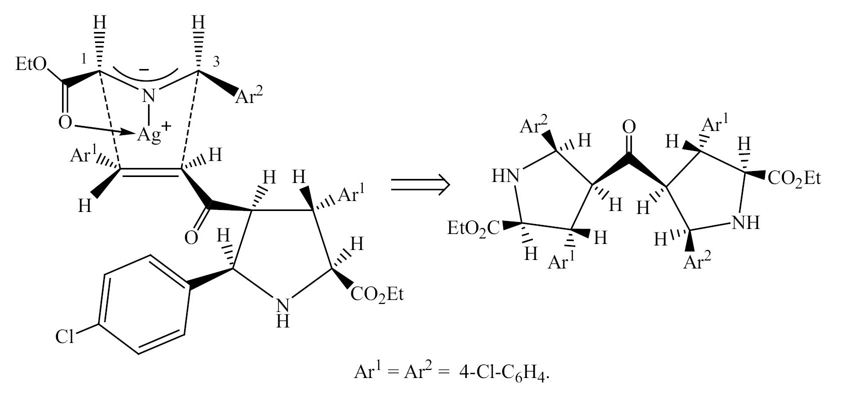Описано довольно много примеров каталитического 1,3-диполярного присоединения иминов эфиров аминокислот по одной двойной связи диарилиденкетонов [16–19]. В то же время, примеры реакции, где был использован избыток имина, и присоединение диполярофила протекало по обеим двойным связям, встречаются редко. Это может быть обусловлено стерическими препятствиями, которые возникают при использовании диполя и диполярофила с арильными заместителями в комбинации с объемными хиральными катализаторами [18, 19]. Однако в случае использования гидроксида натрия с тетрабутиламмоний бромидом [6] и при использовании комплекса ацетата серебра с трифенилфосфином [5] наблюдалось образование соответствующих диаддуктов.