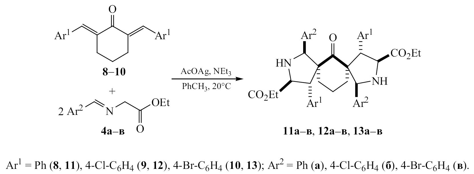 Реакцию алкенов 8–10 с двукратным количеством арилальдиминов 4a–в проводили в толуоле в присутствии ацетата серебра и полуторакратного избытка триэтиламина без доступа света [20]. Ход реакции контролировали методом ТСХ. В качестве основного продукта (87–95%), по данным спектроскопии ЯМР 1Н, получались рацемические смеси соответствующих диаддуктов – производных 6-оксо-2,9-диазадиспиро[4.1.47.35]тетрадекана 11a–в, 12a–в, 13a–в (схема 4). Полученные соединения выделяли методом кристаллизации из смеси петролейного эфира и CH2Cl2 (6:1).
