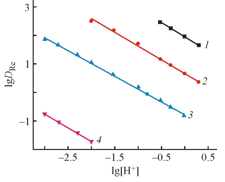 Природа органического растворителя оказывает существенное влияние на эффективность экстракции Re(VII). Величина DRe возрастает по мере увеличения полярности органического растворителя (табл. 1), что характерно для экстракции ионных ассоциатов. Аналогичная зависимость эффективности экстракции рения от природы органического растворителя получена при экстракции фосфорилированными аминами [15, 16].