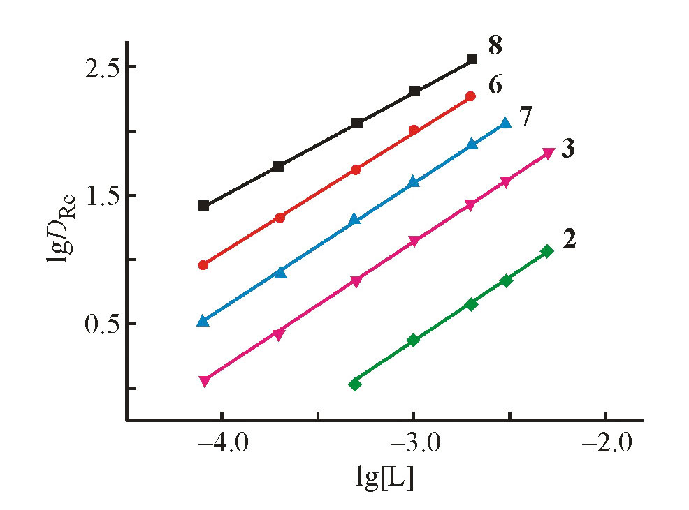 Рассмотрено влияние состава водной фазы на эффективность экстракции Re(VII) раствором соединения 8 в дихлорэтане. При постоянной концентрации ионов Cl– в водной фазе зависимость коэффициента распределения рения (DRe) от рН равновесной водной фазы выражается кривой с максимумом (рис. 1). Увеличение DRe с уменьшением величины рН связано с увеличением доли протонированной формы экстрагента (L) в органической фазе, что способствует экстракции Re(VII) в виде ионной пары LH+ReO4– по анионообменному механизму: