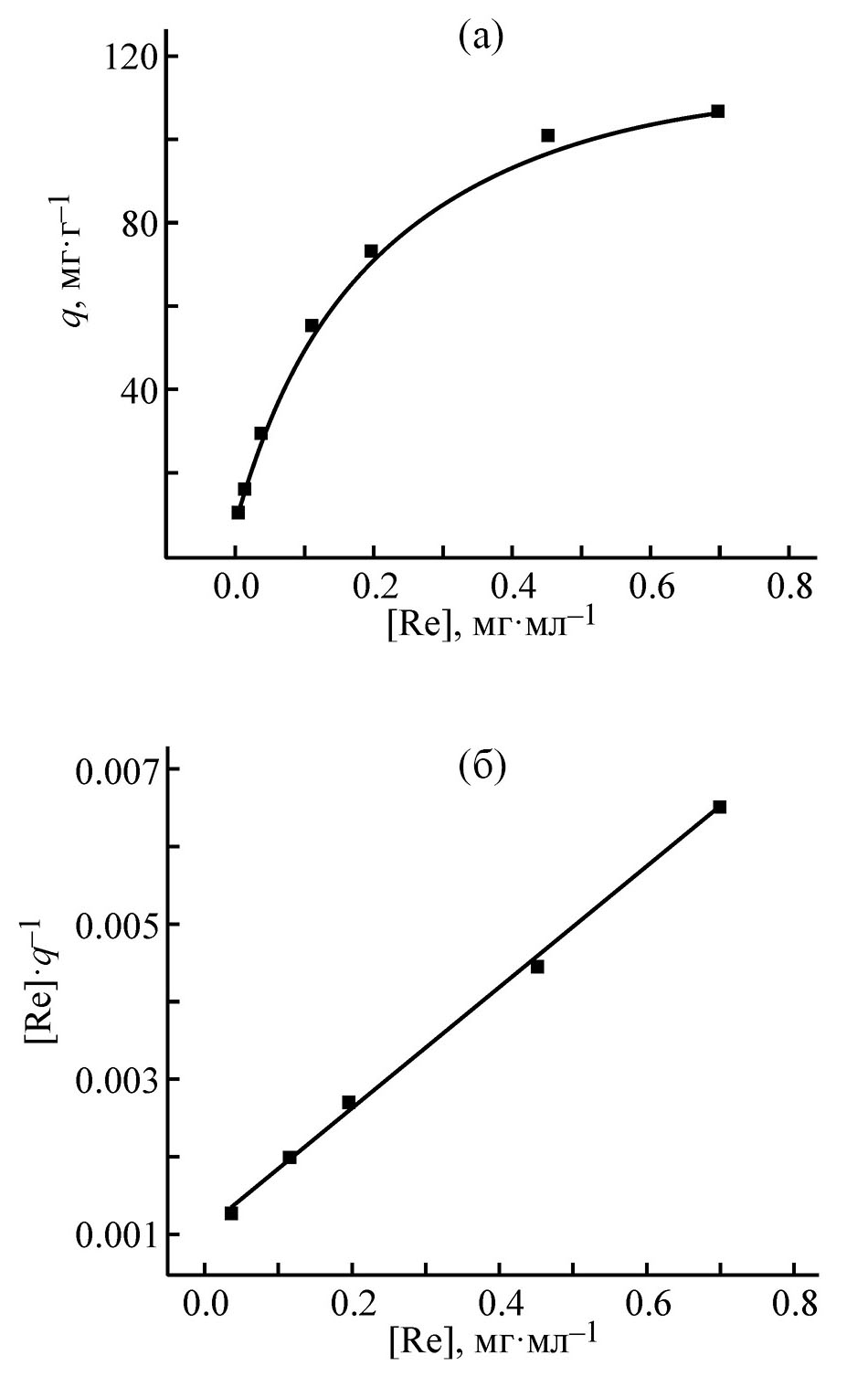 где [Re] (мг/мл) – концентрации рения в равновесной водной фазе, qm (мг/г) – максимальная концентрация Re(VII) в фазе сорбента, K – константа равновесия. Значения qm и K, определенные графически после линеаризации уравнения (4) в координатах [Re]/qe–[Re] (рис. 7б), составляют 107±6.4 и 10.5±0.73 мл/мг соответственно. Определенное значение qm соответствует стехиометрии сорбируемого комплекса Re:L = 2:1.