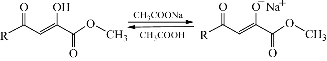 Добавление ацетата натрия в реакционную смесь, как показано ранее, способствует образованию амидов 1–5. По-видимому, это объясняется тем, что ацетат натрия вступает в обменное взаимодействие с исходным эфиром ароилпировиноградной кислоты, образуя натрийпроизводное, в котором происходит дезактивация карбонильной группы в α-положении и, следовательно, становится возможной атака сложноэфирного карбонильного фрагмента первичной аминогруппой 4-аминобензойной кислоты (схема 2) [17, 18].
